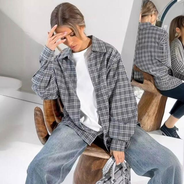 新品 含發票 2024歐美春秋新款灰色氣質格紋oversize寬松翻領女式襯衫時尚女裝