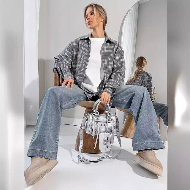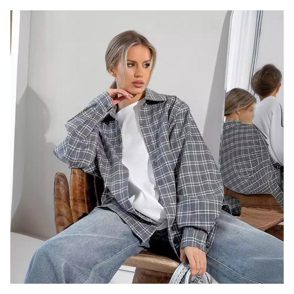 新品 含發票 2024歐美春秋新款灰色氣質格紋oversize寬松翻領女式襯衫時尚女裝