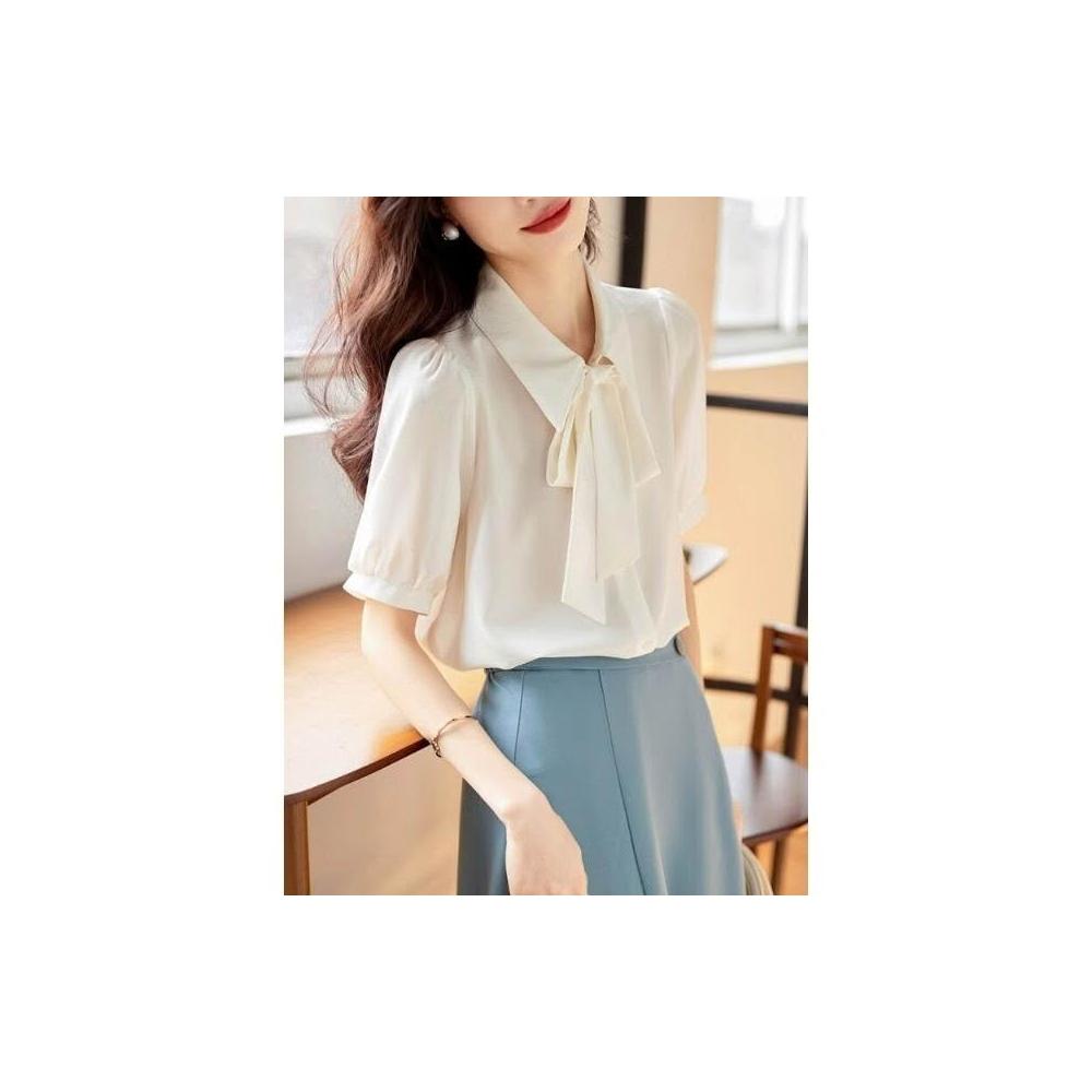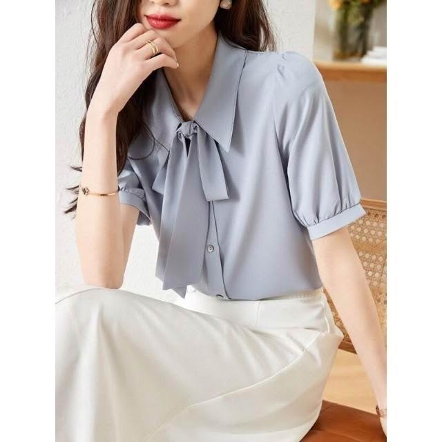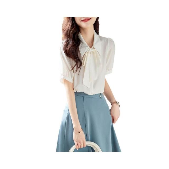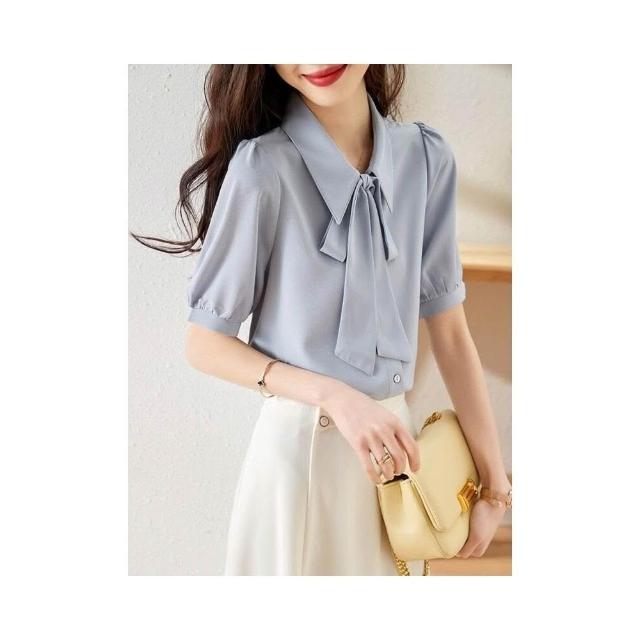 新品 含發票 現貨煙藍色雪紡短袖襯衫女2025夏小個子垂感韓系飄帶上衣溫柔風