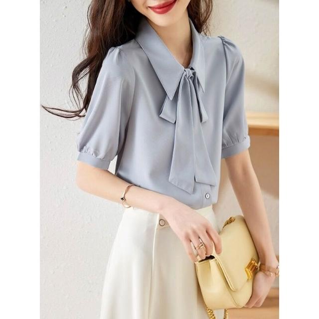 新品 含發票 現貨煙藍色雪紡短袖襯衫女2025夏小個子垂感韓系飄帶上衣溫柔風