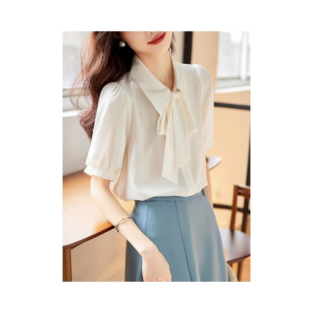 新品 含發票 現貨煙藍色雪紡短袖襯衫女2025夏小個子垂感韓系飄帶上衣溫柔風