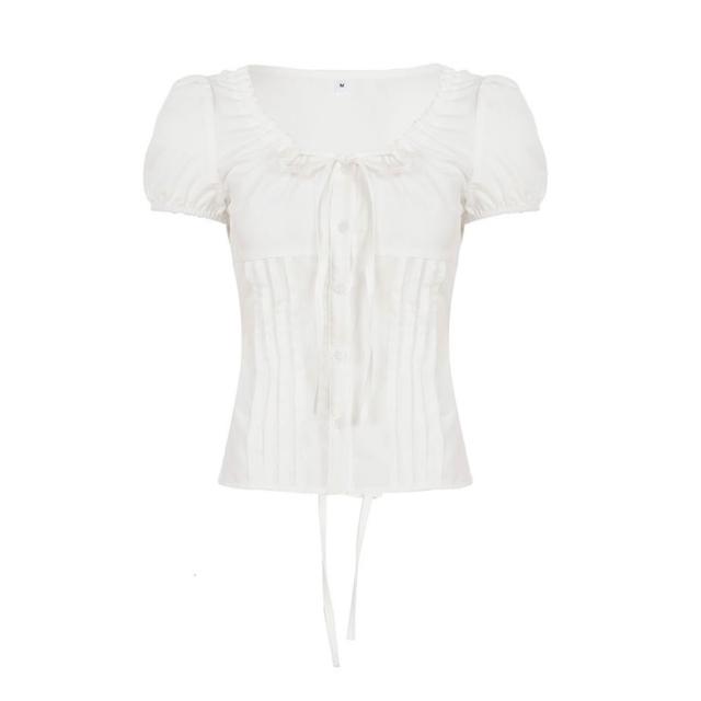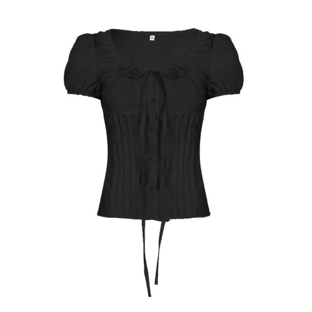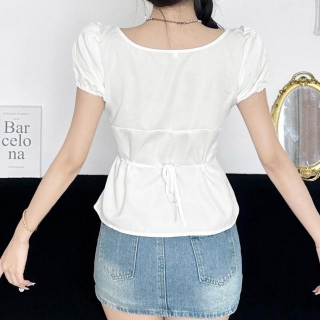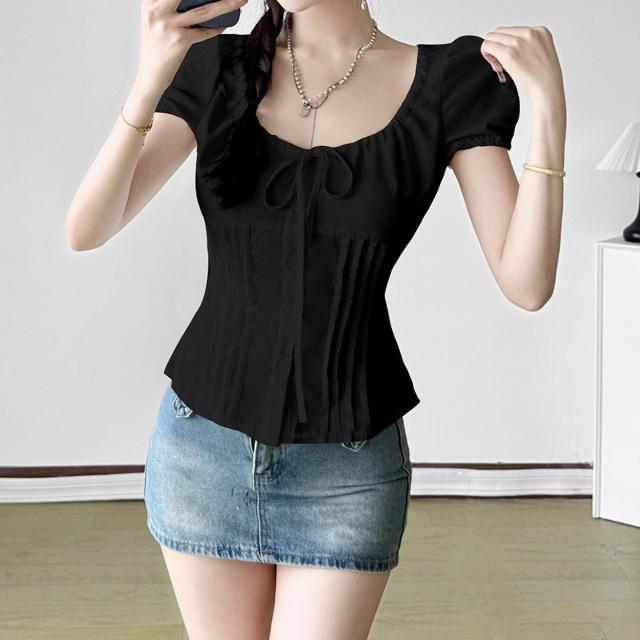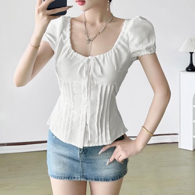 新品 含發票 韓系甜美少女風純色蝴蝶結綁帶收腰襯衣夏季泡泡袖修身顯瘦短上衣