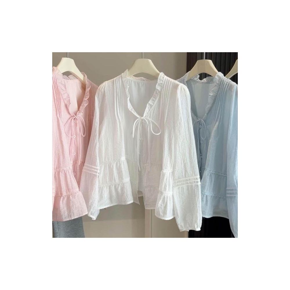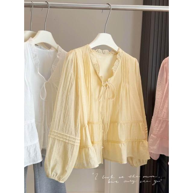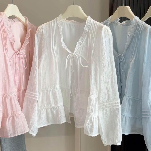 新品 含發票 2026春夏季薄款木耳邊V領綁帶襯衫女法式寬松燈籠袖內搭上衣襯衣