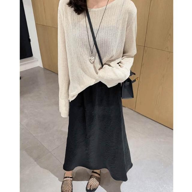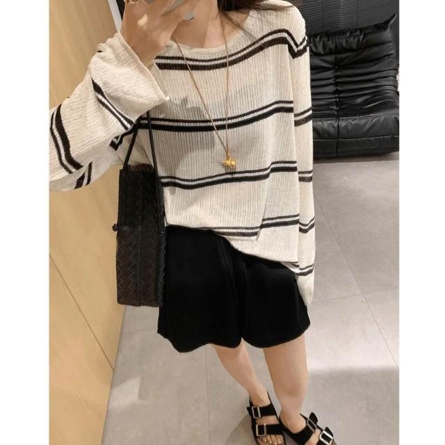 新品 含發票 韓系藏青色條紋防曬空調衫長袖t恤寬松後背開叉上衣罩衫薄女夏季