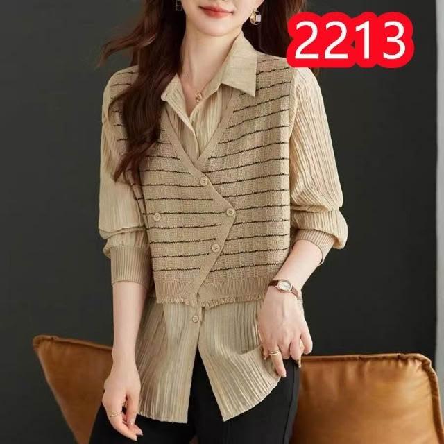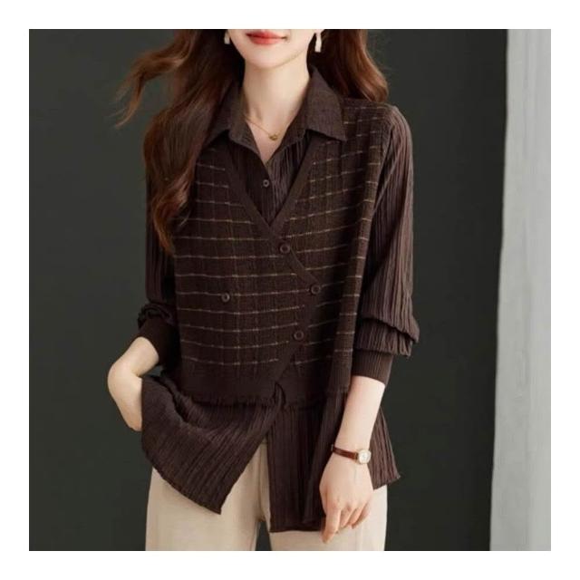 新品 含發票 早秋裝鈕扣假兩件條紋襯衣女中長款寬松針織衫洋氣遮屁股上衣