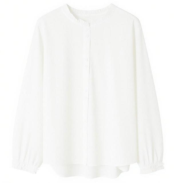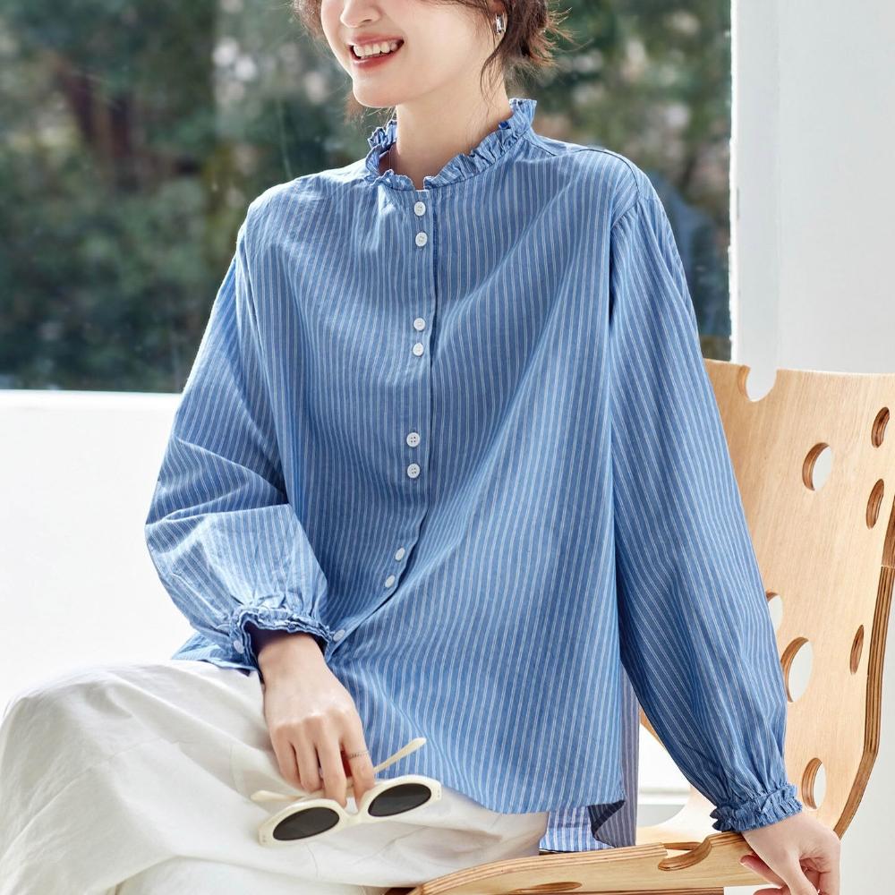 新品 含發票 藍色條紋襯衫女長袖2026春裝新款木耳領內搭疊穿上衣襯衣