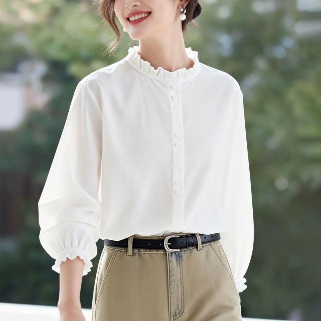 新品 含發票 藍色條紋襯衫女長袖2026春裝新款木耳領內搭疊穿上衣襯衣