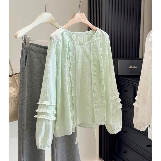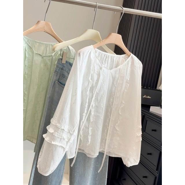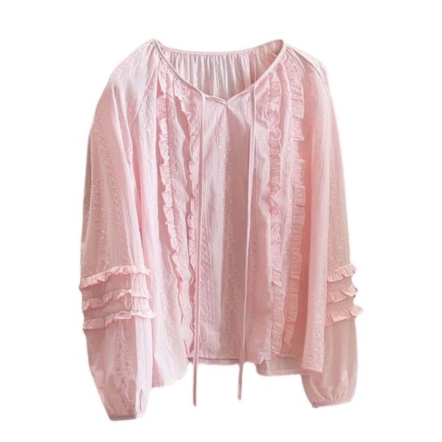新品 含發票 法式小眾減齡長袖襯衫女春季設計感木耳花拼接寬松V領燈籠袖上衣