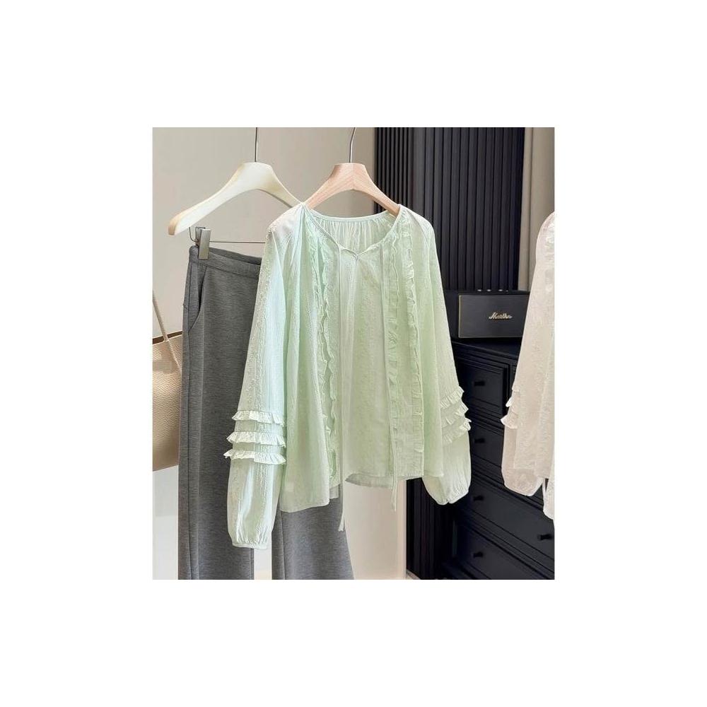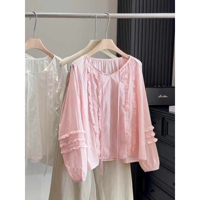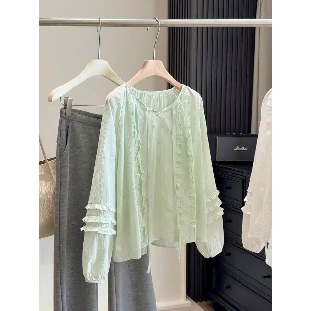 新品 含發票 法式小眾減齡長袖襯衫女春季設計感木耳花拼接寬松V領燈籠袖上衣