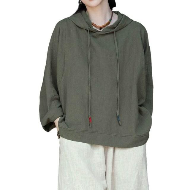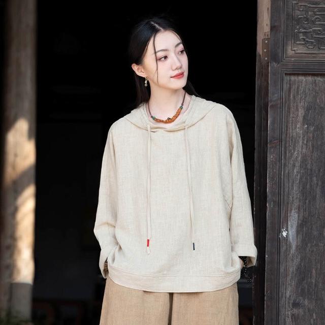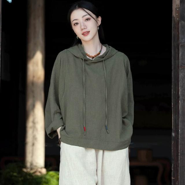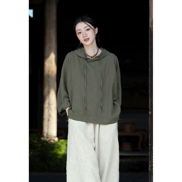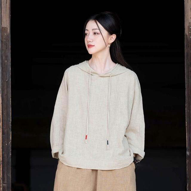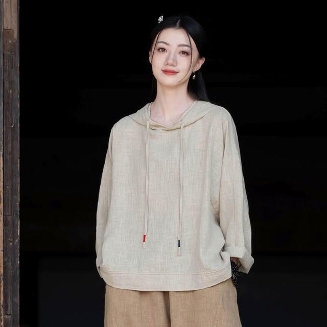 新品 含發票 26春季新款苎麻砂洗連帽套頭休閑襯衫上衣女文藝個性棉麻長袖T恤