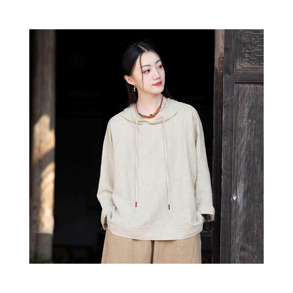 新品 含發票 26春季新款苎麻砂洗連帽套頭休閑襯衫上衣女文藝個性棉麻長袖T恤