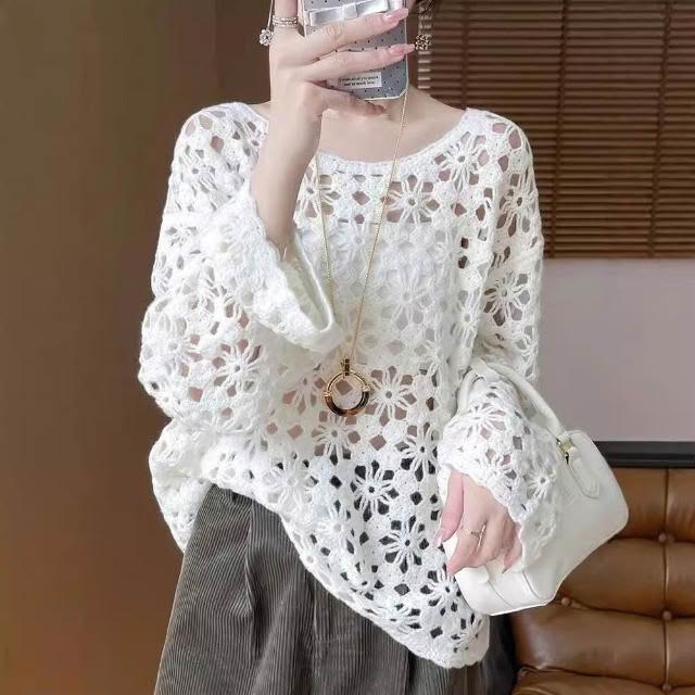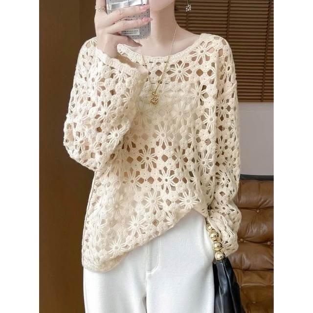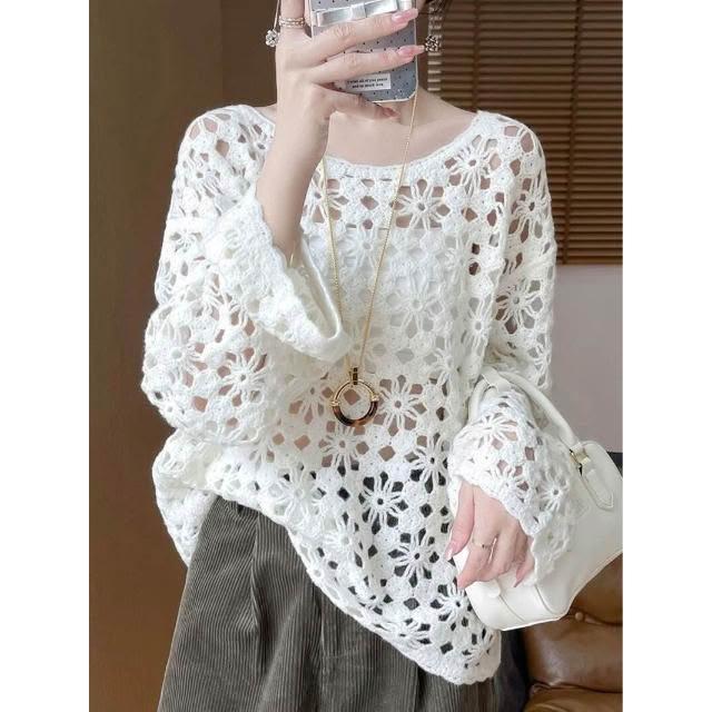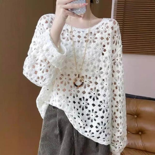 新品 含發票 早秋勾花镂空純色V領慵懶風軟糯羊針織上衣套頭罩衫慵懶顯瘦