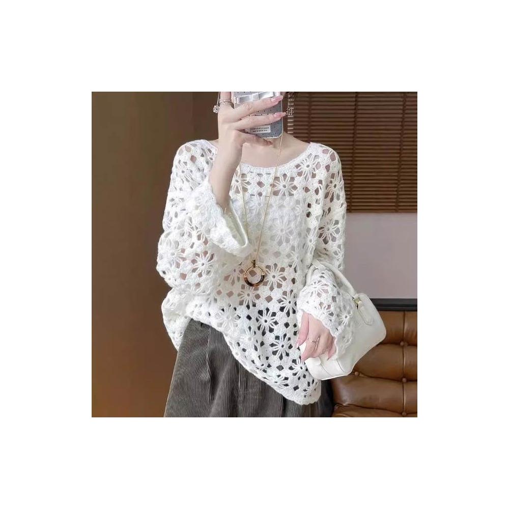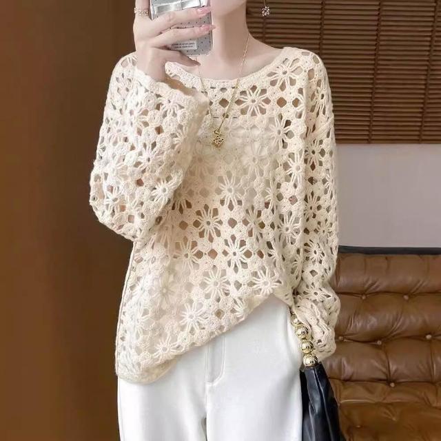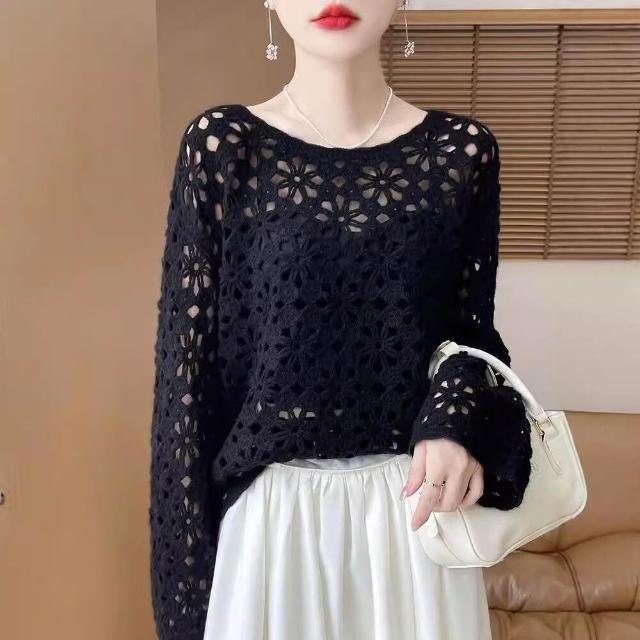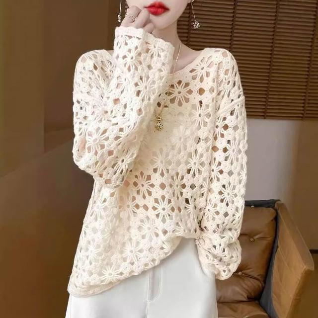 新品 含發票 早秋勾花镂空純色V領慵懶風軟糯羊針織上衣套頭罩衫慵懶顯瘦