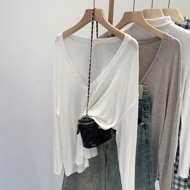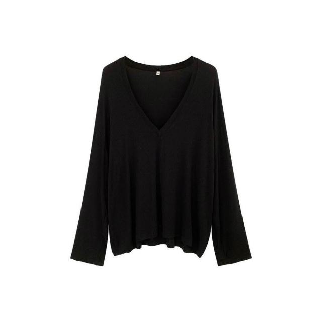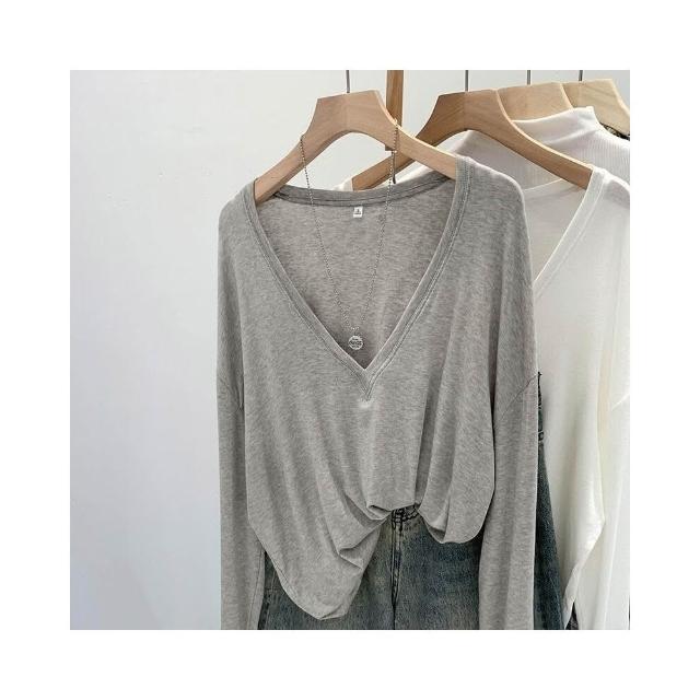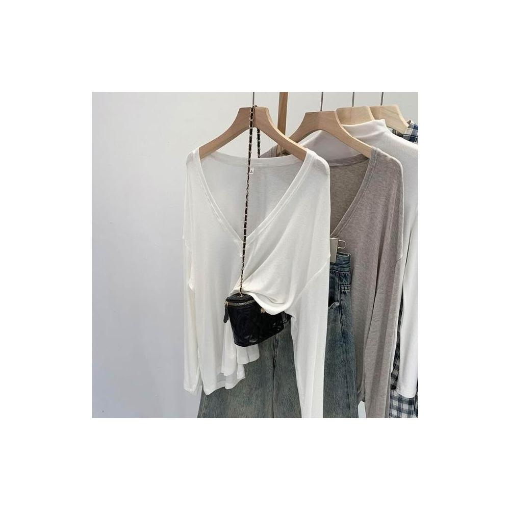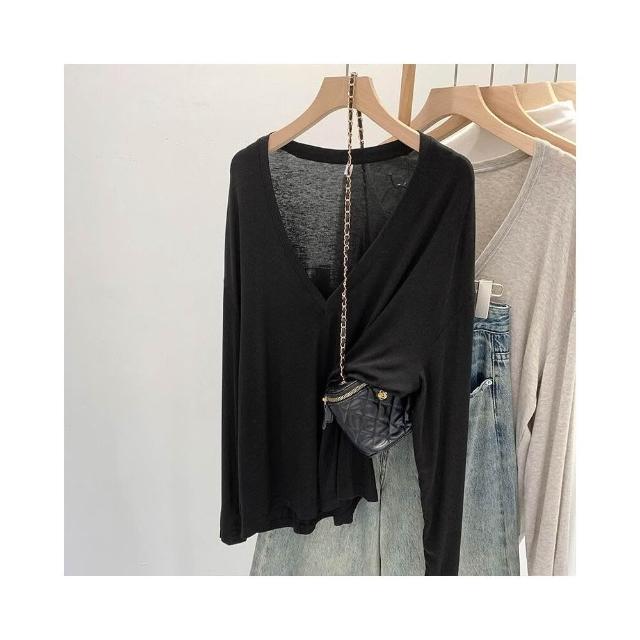 新品 含發票 寬松顯瘦慵懶風薄款內搭深V領長袖打底T恤女春夏空調防曬罩衫上衣