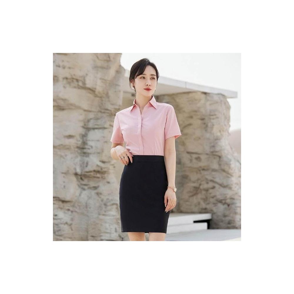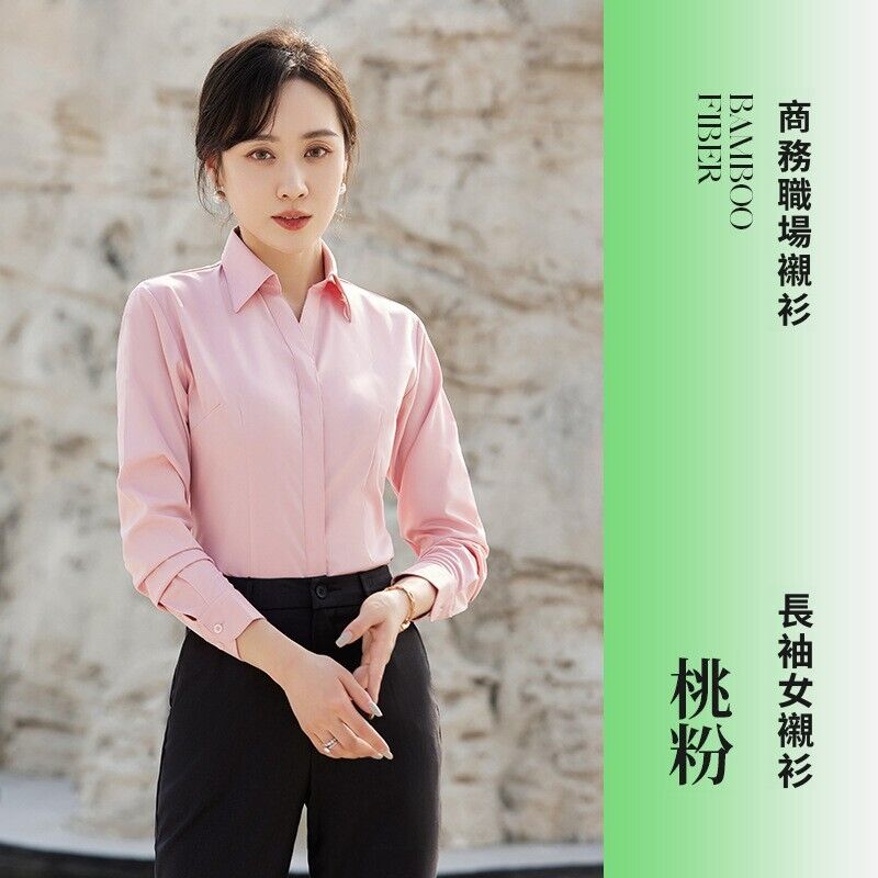 新品 含發票 V領粉襯衫女竹纖維彈力工作服酒店前臺售樓部正裝職業襯衣OL 刺繡