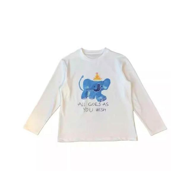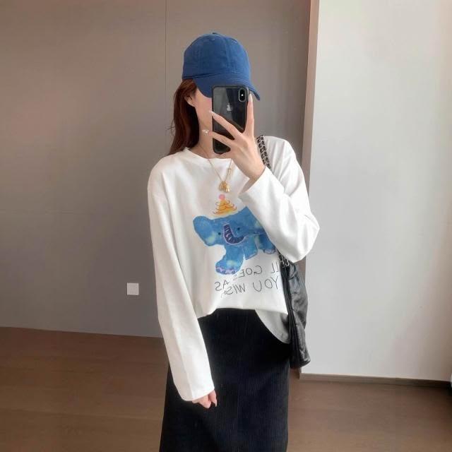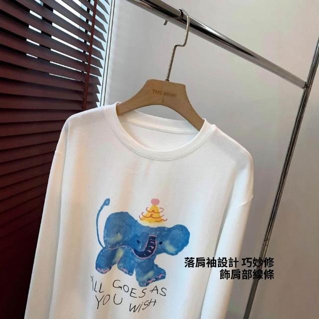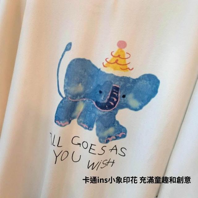 新品 含發票 春不晚 減齡佰搭 撞色小藍象印花寬松H版圓領落肩袖白T恤打底