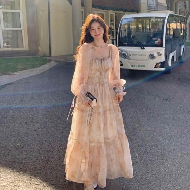 新品 含發票 法式方領泡泡袖雪紡碎花連衣裙女春秋仙女裙初戀溫柔風森系長裙