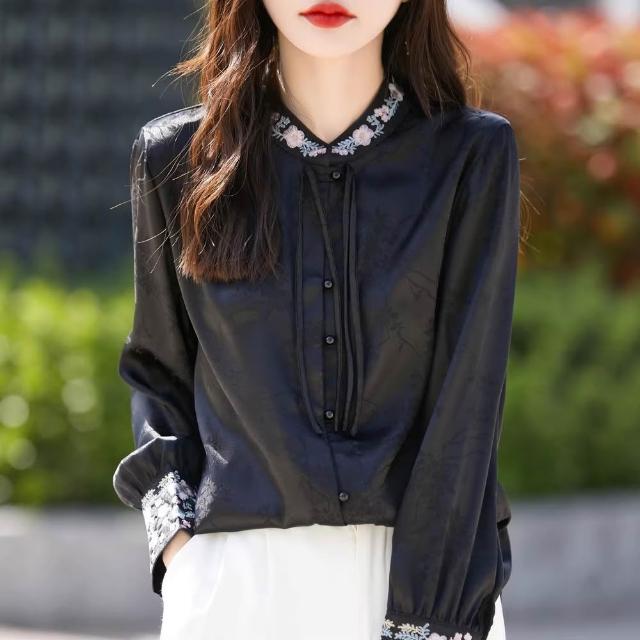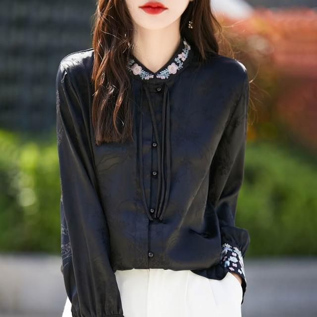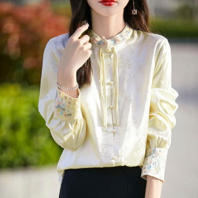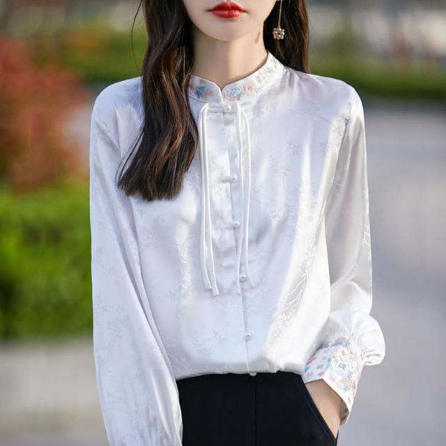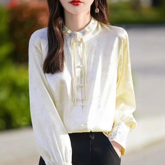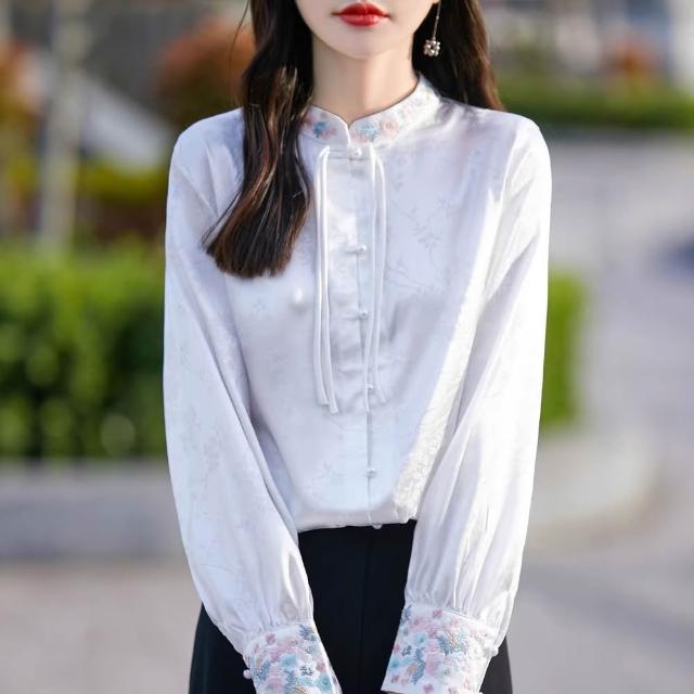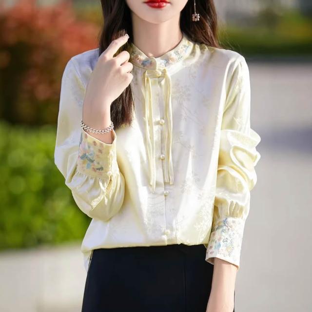 新中式2026春夏季薄款國風襯衫女立領印花珍珠扣氣質襯衣寬松上衣