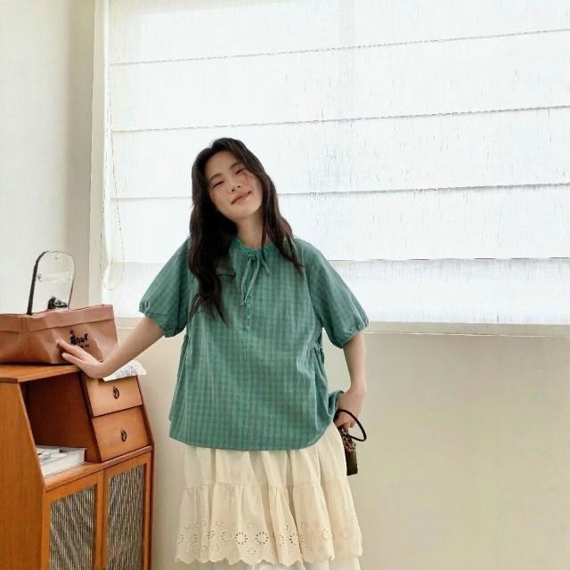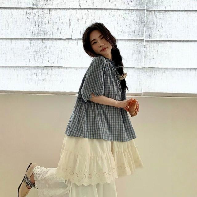 新品 含發票 日系小清新格紋襯衫女夏季圓領短袖上衣新款寬松韓系文藝百搭小衫