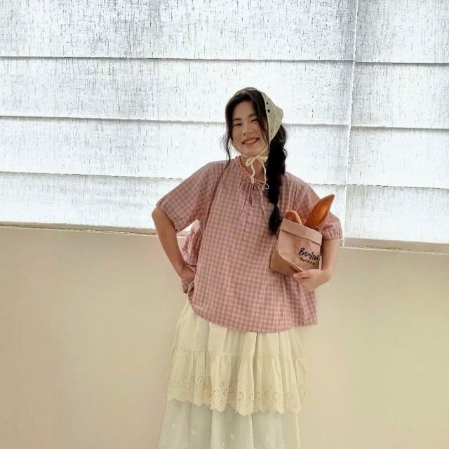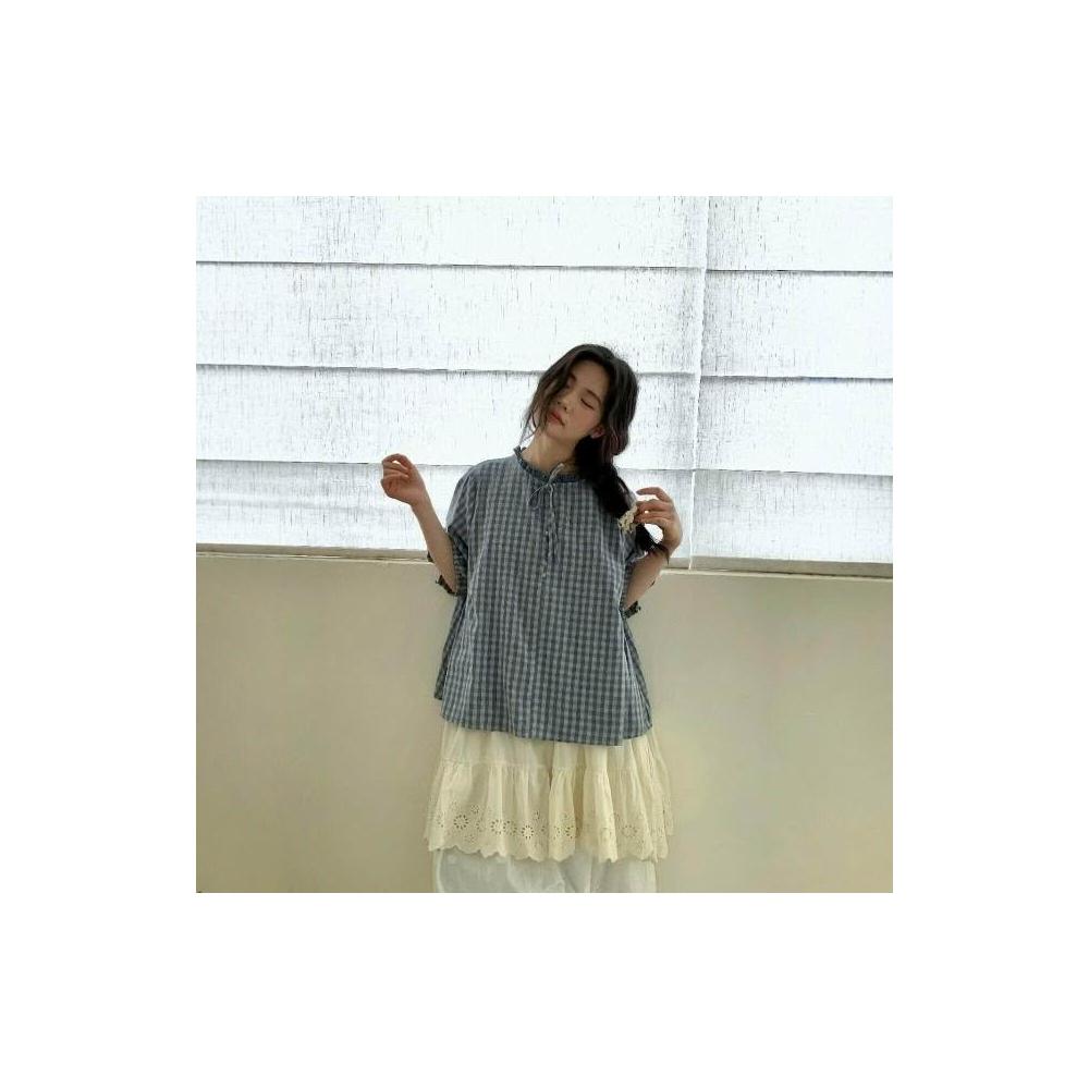 新品 含發票 日系小清新格紋襯衫女夏季圓領短袖上衣新款寬松韓系文藝百搭小衫