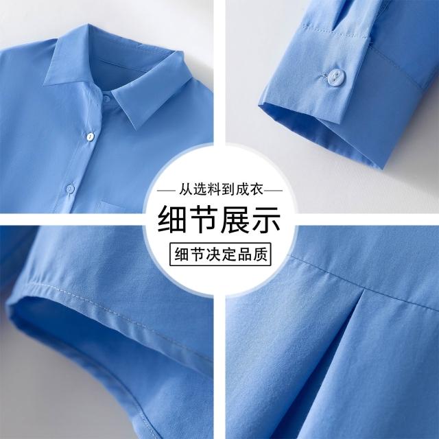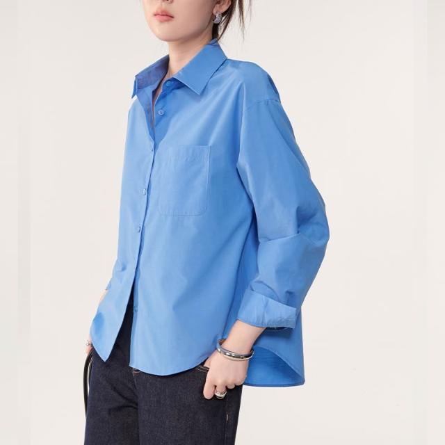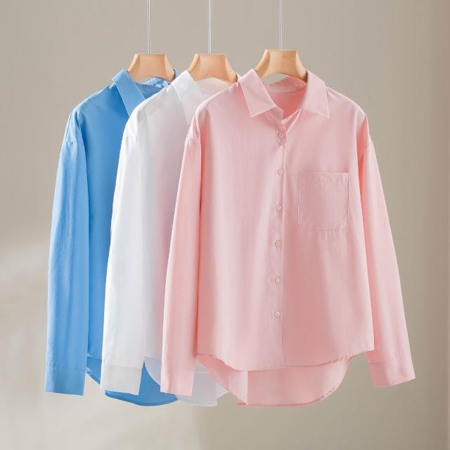 2026春季新款翻領百搭長袖純色襯衫前短後長時尚寬松休閑上衣女