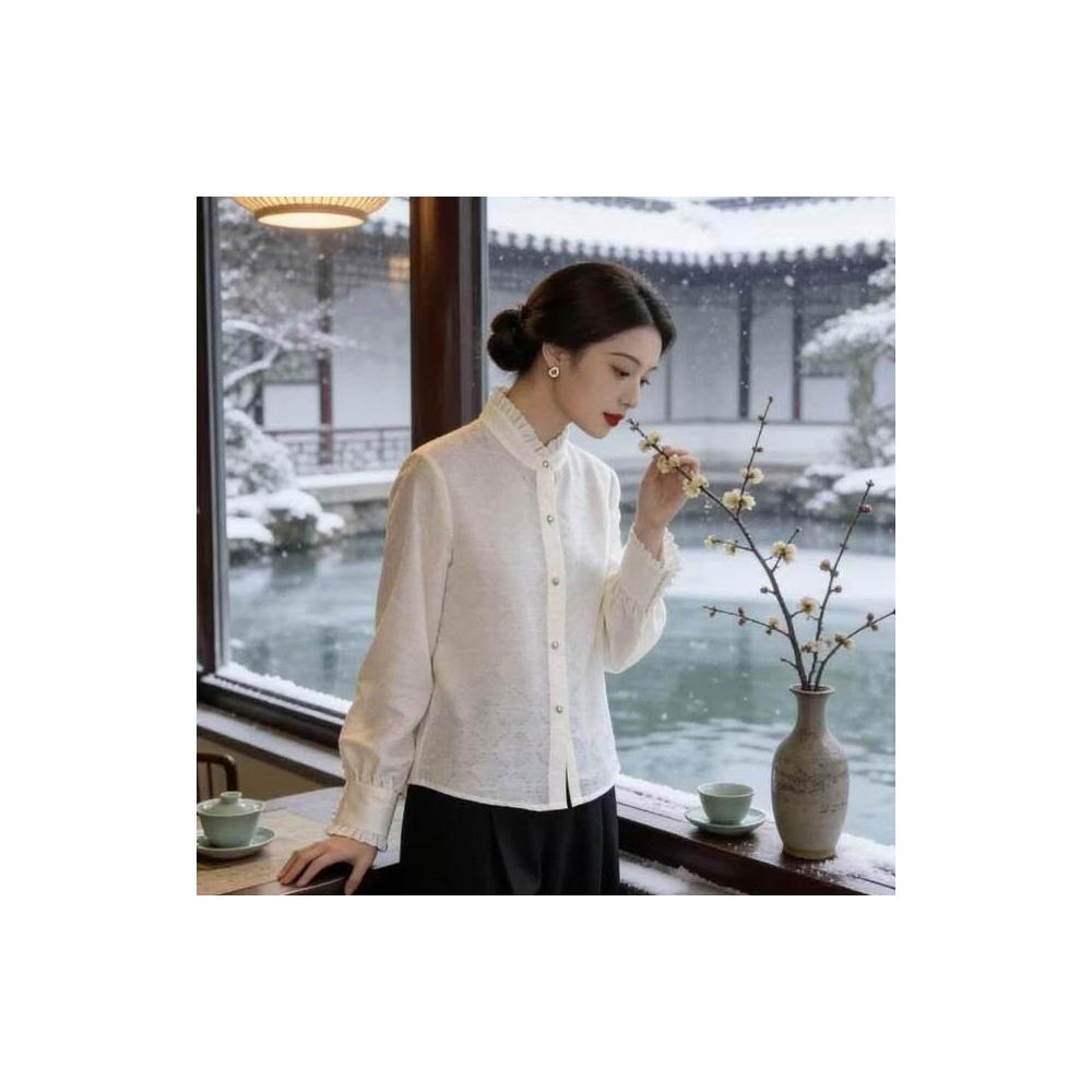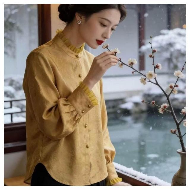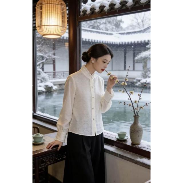 新品 含發票 新中式國風女裝香雲紗浮光錦提花氣質花邊領襯衫氣質百搭襯衣