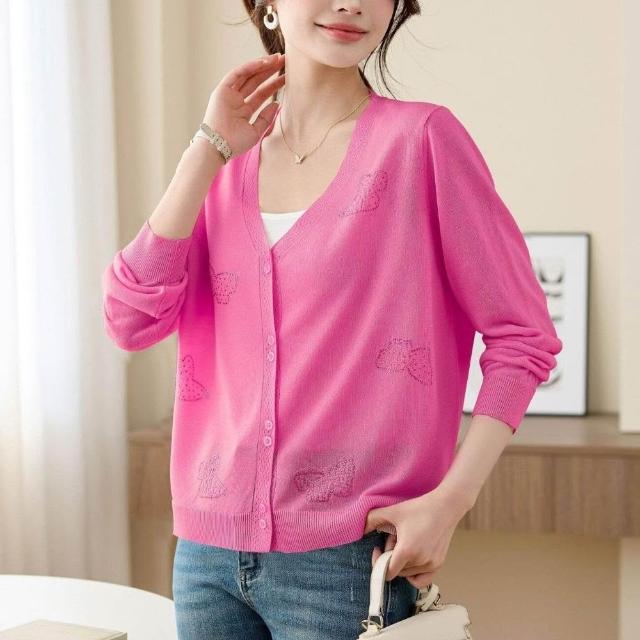 新品 含發票 2026年夏季薄款冰絲防曬開衫女V領蝴蝶燙鉆寬松外搭針織空調衫潮