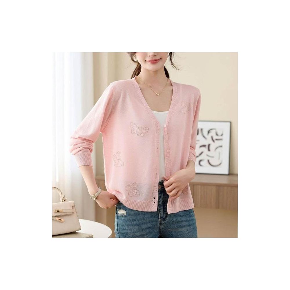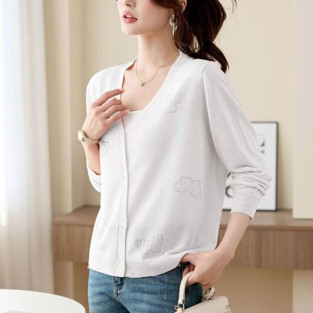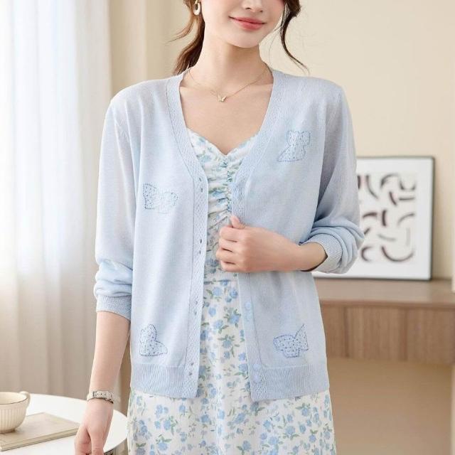 新品 含發票 2026年夏季薄款冰絲防曬開衫女V領蝴蝶燙鉆寬松外搭針織空調衫潮