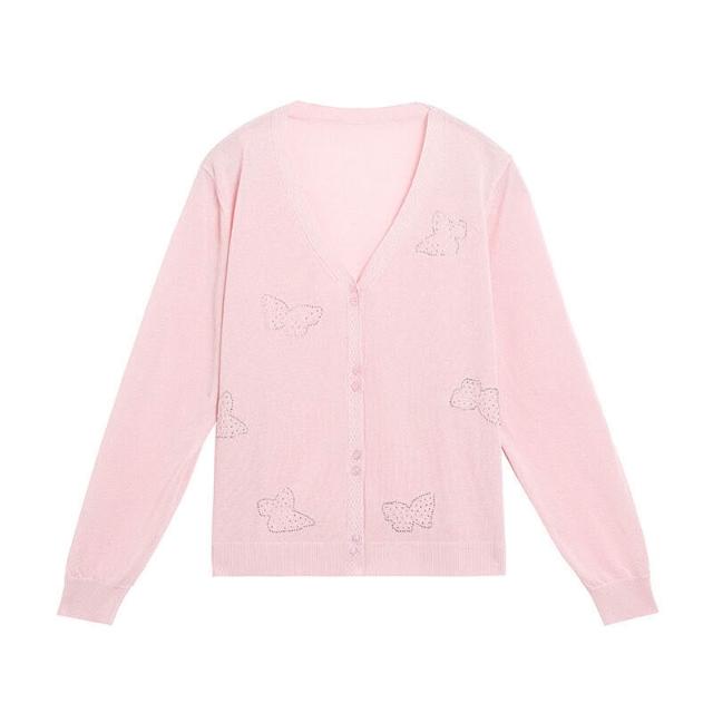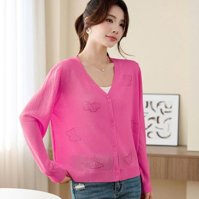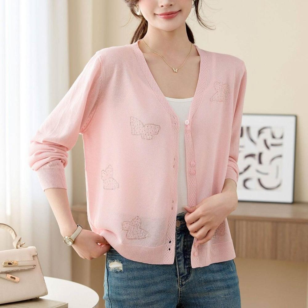 新品 含發票 2026年夏季薄款冰絲防曬開衫女V領蝴蝶燙鉆寬松外搭針織空調衫潮