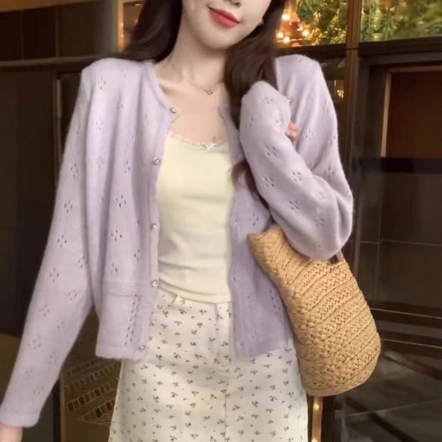 新品 含發票 甜妹镂空針織衫紫色開衫女春夏季韓系溫柔風小個子外搭淺紫色上衣