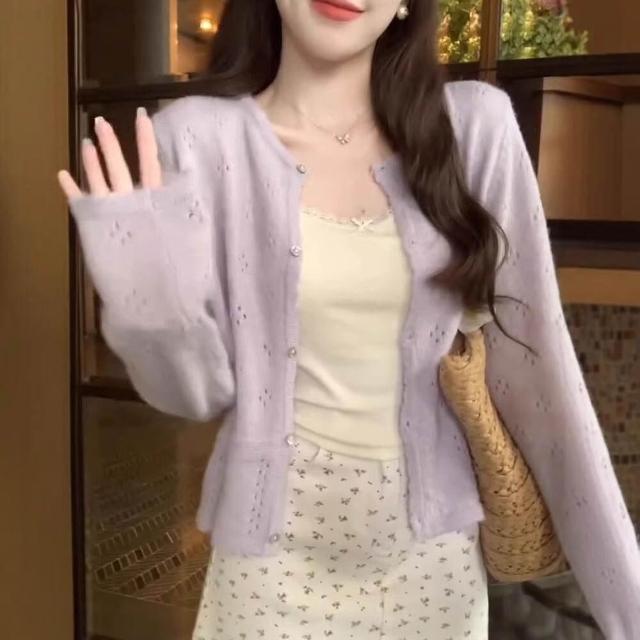 新品 含發票 甜妹镂空針織衫紫色開衫女春夏季韓系溫柔風小個子外搭淺紫色上衣