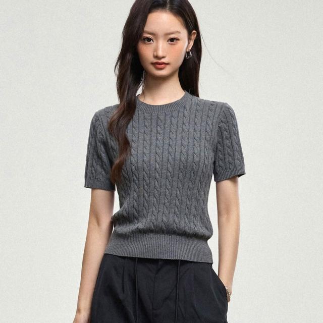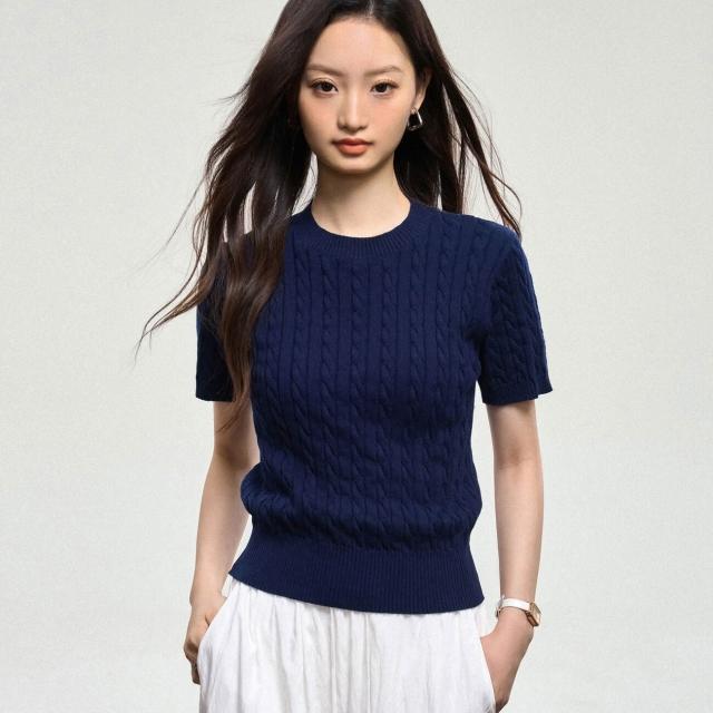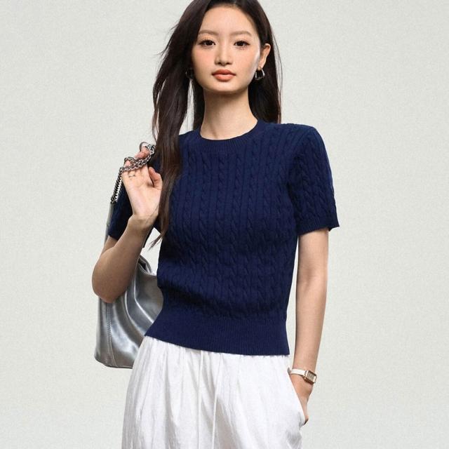 新品 含發票 100%棉針織衫女夏季新款氣質高級感顯瘦麻花顯瘦短袖圓領上衣薄款