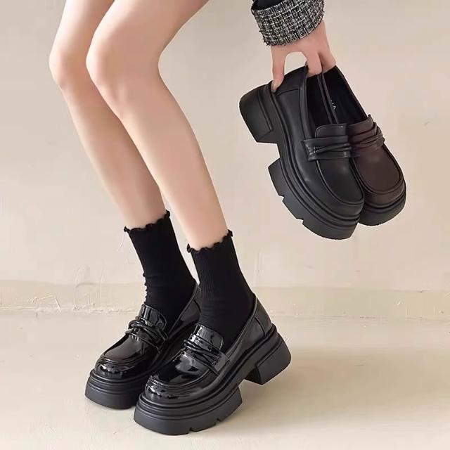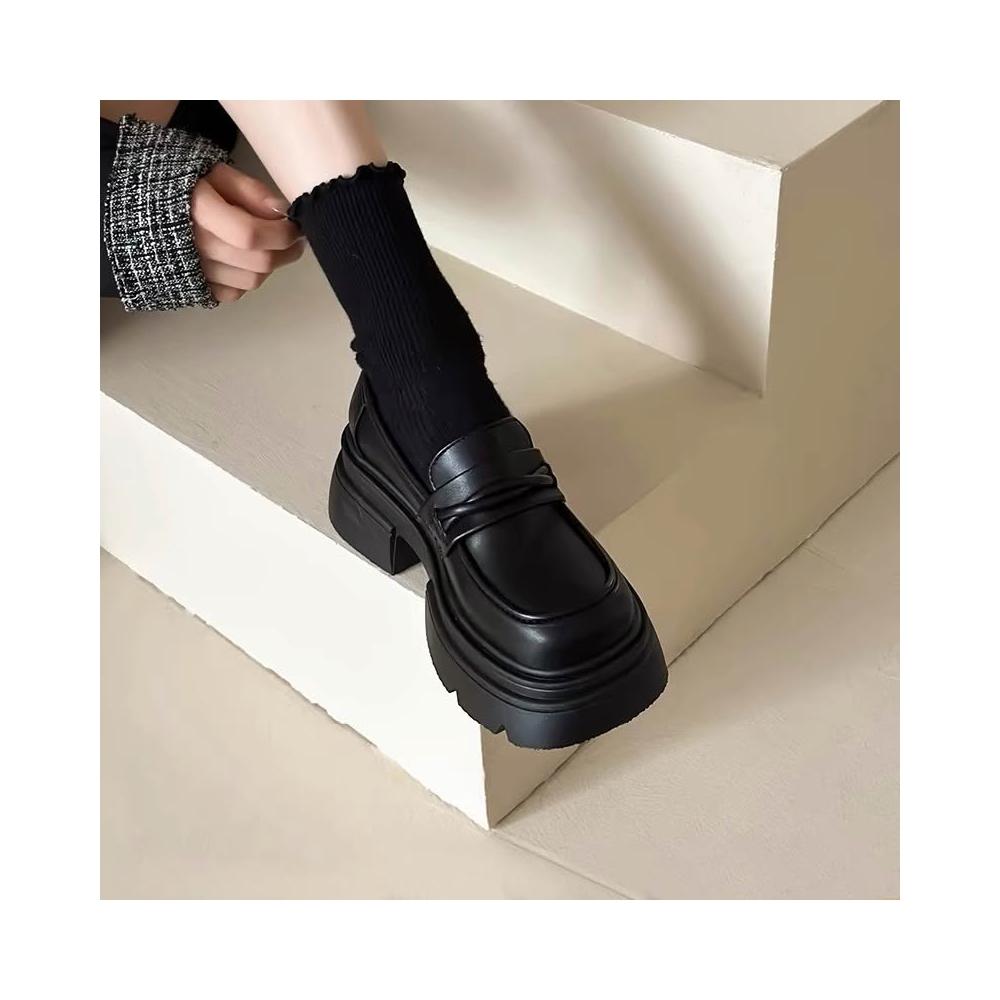 新品 含發票 牛皮版~英倫風厚底真皮小皮鞋女復古黑色休閑松糕鞋一腳蹬樂福鞋