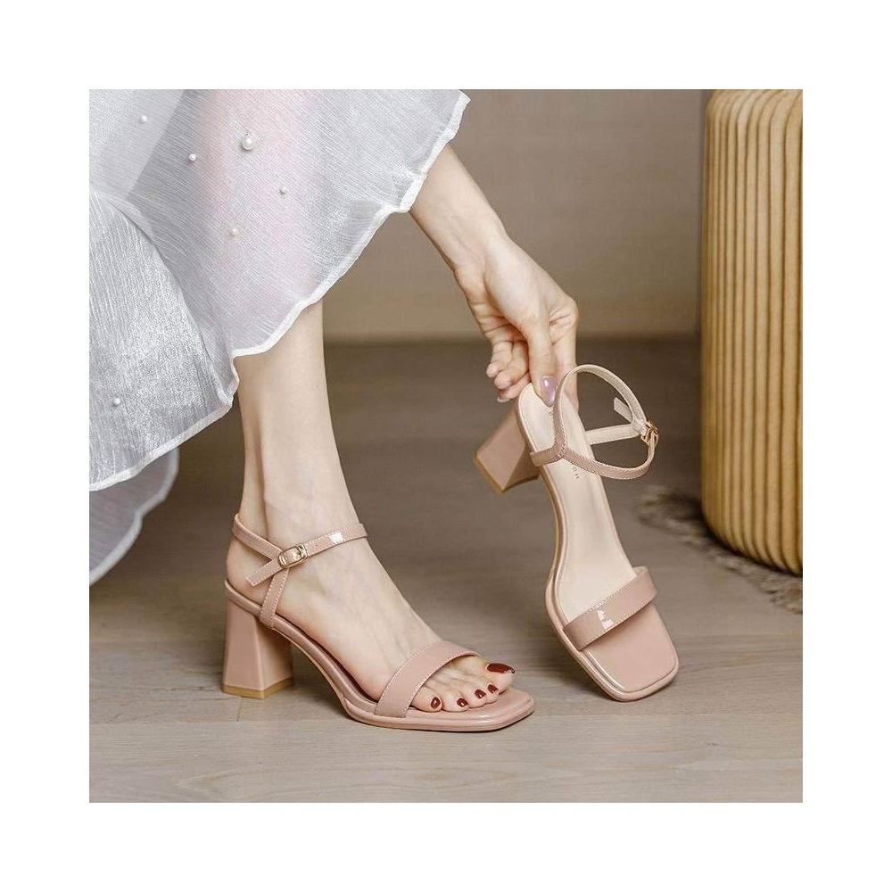 新品 含發票 裸粉色高跟鞋女粗跟簡約溫柔仙女風配裙一字帶露趾方頭涼鞋女夏季