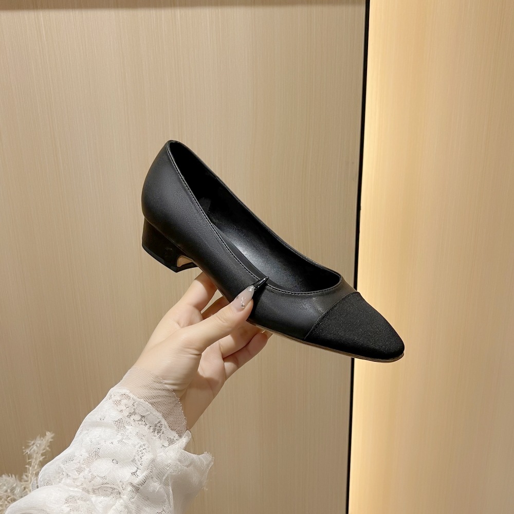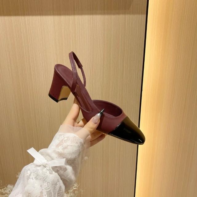 新品 含發票 酒紅色小香風粗跟單鞋女後絆帶方頭拼色中跟後空包頭涼鞋百搭