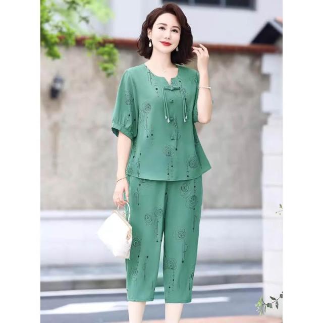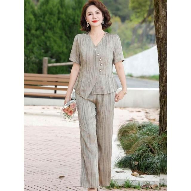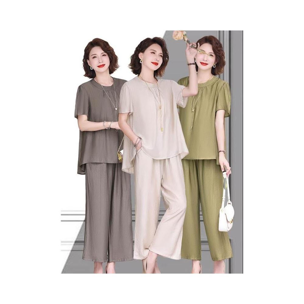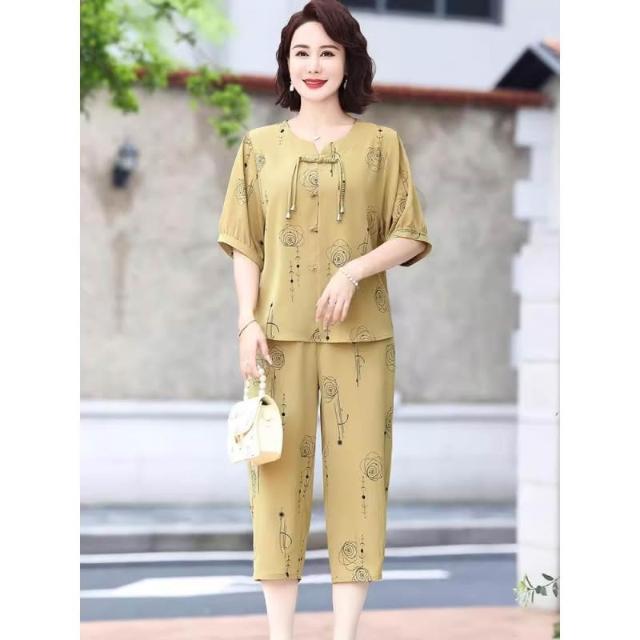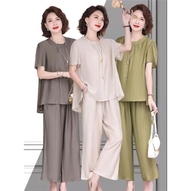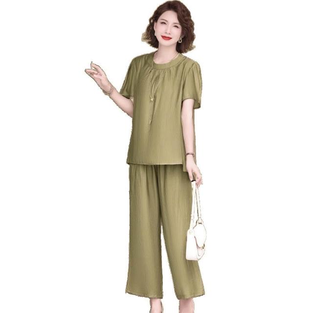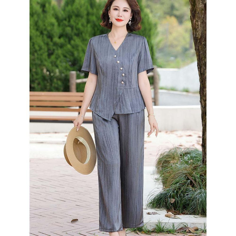 新品 含發票 媽媽夏裝短袖套裝女2025新款中老年人洋氣遮肚子顯瘦闊腿褲兩件套