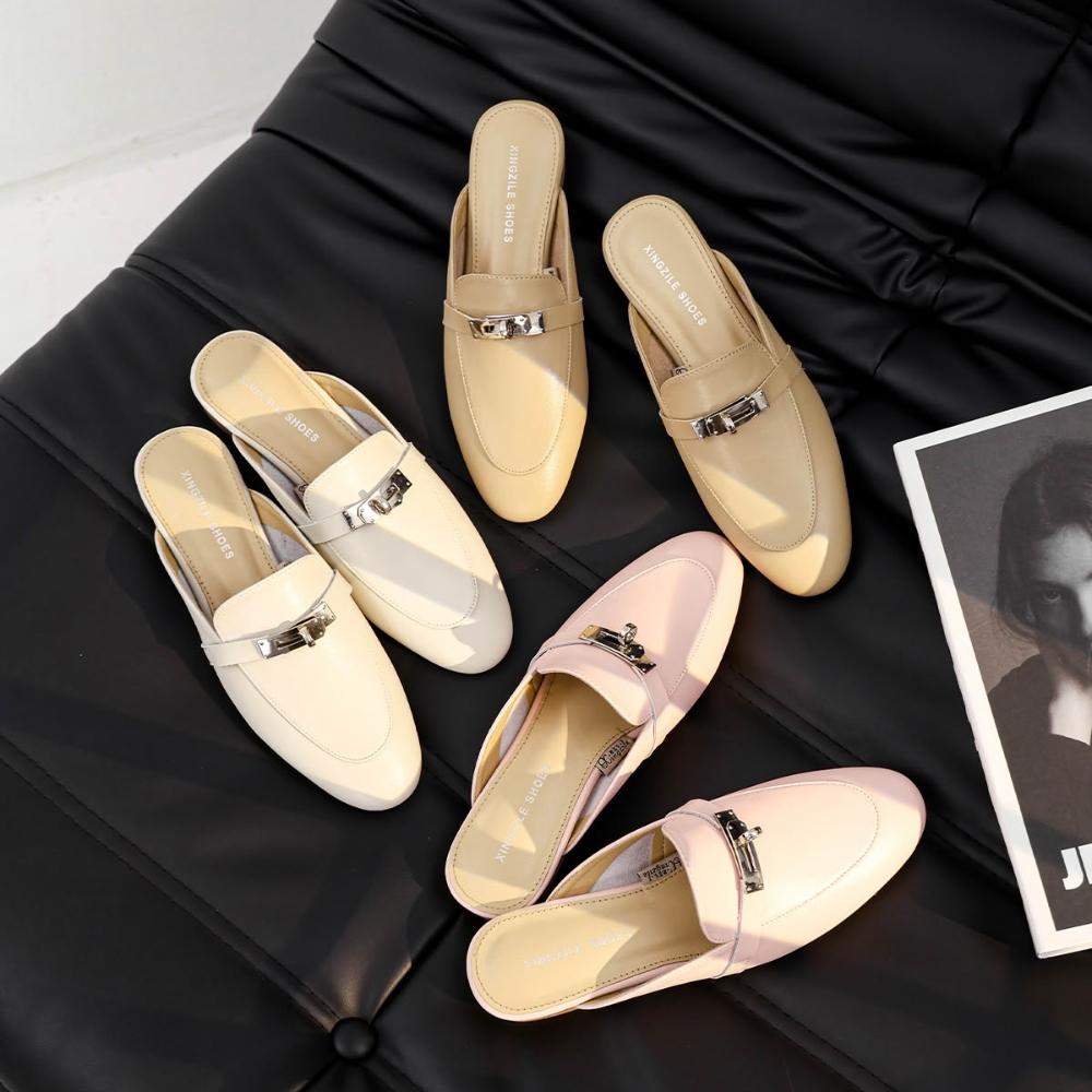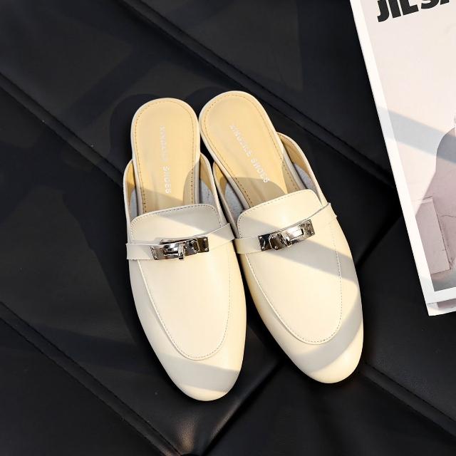 新品 含發票 羊皮包頭半拖鞋女外穿涼拖2024年春夏季新款鎖扣懶人鞋平底穆勒鞋