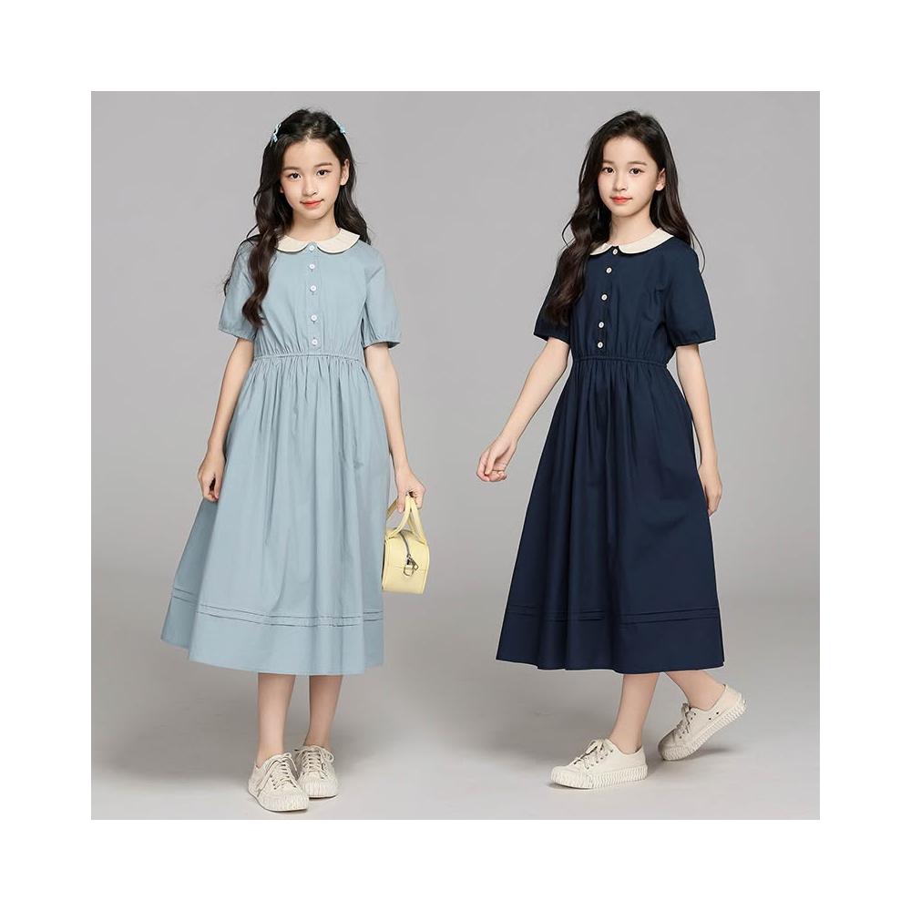 新品 含發票 女童中大童娃娃領夏季連衣裙2025新款收腰氣質裙子女孩學院風長裙