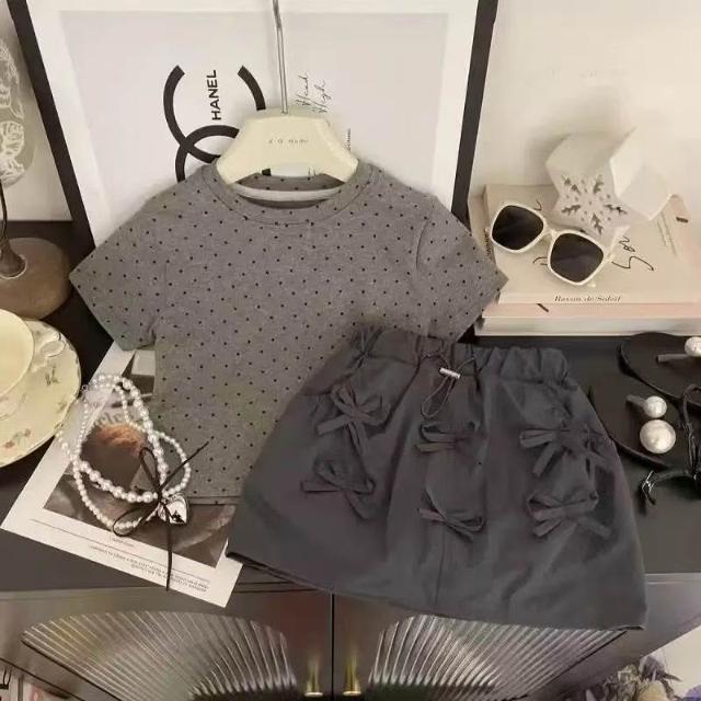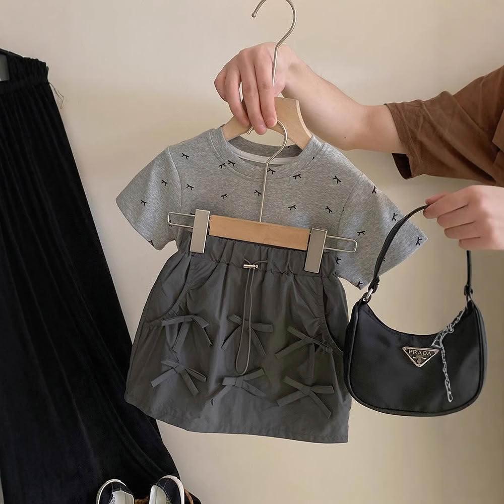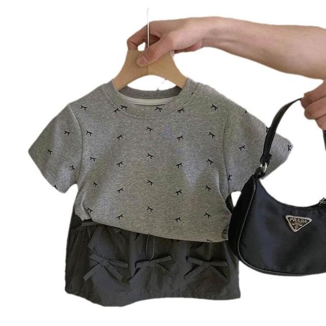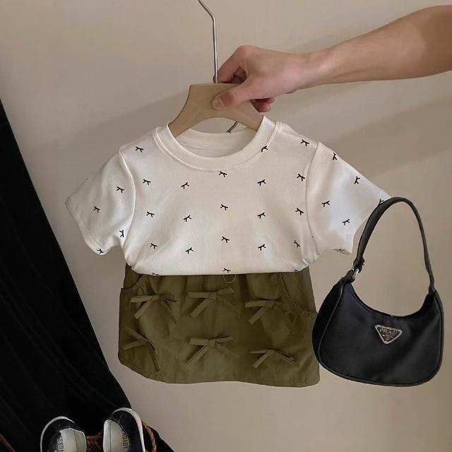 新品 含發票 夏季女童套裝寶寶洋氣兒童個性潮外貿韓版蝴蝶結時髦短袖T恤短裙