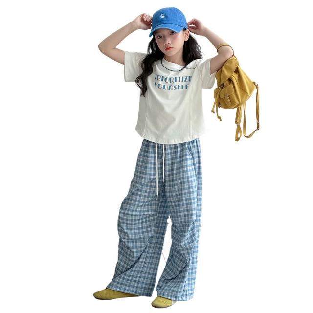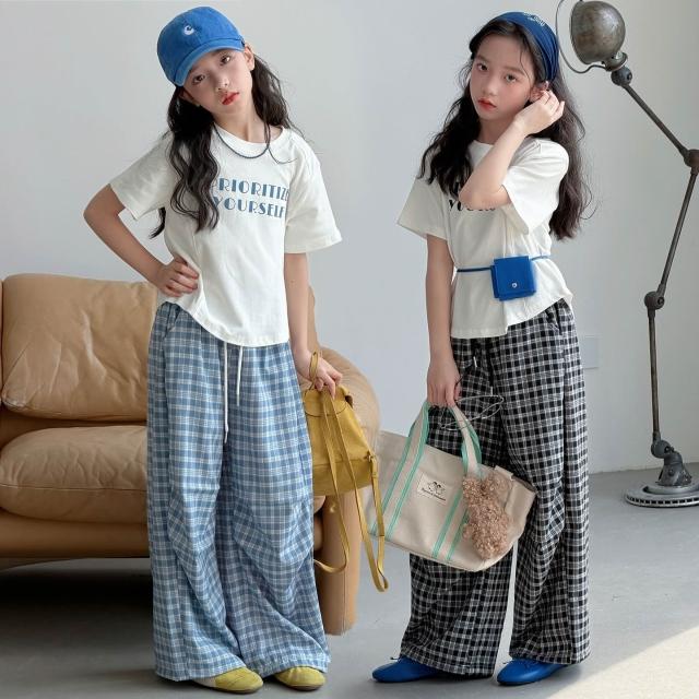 新品 含發票 夏季中大女童短袖t格子褲套裝童裝兒童女孩短袖T恤薄款長褲兩件套