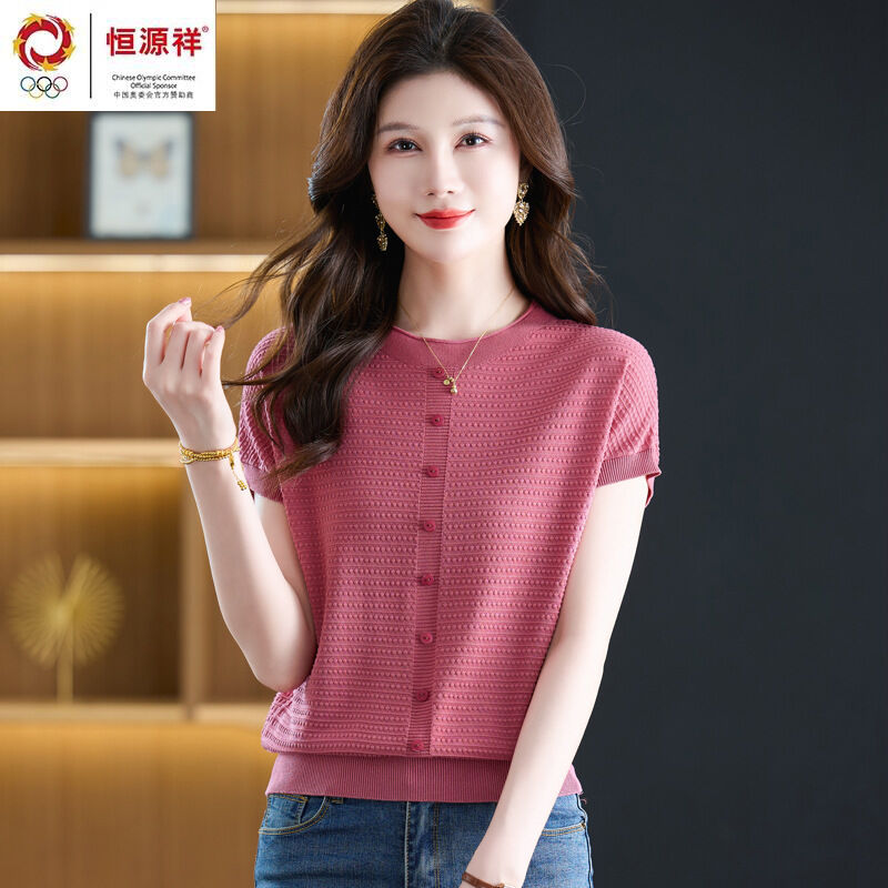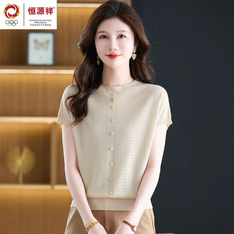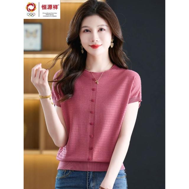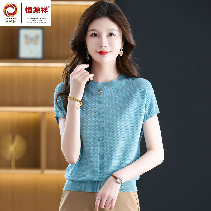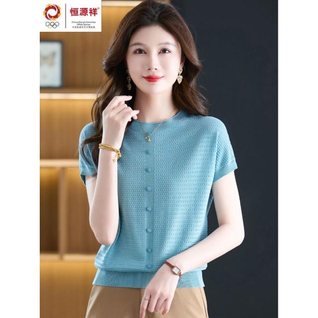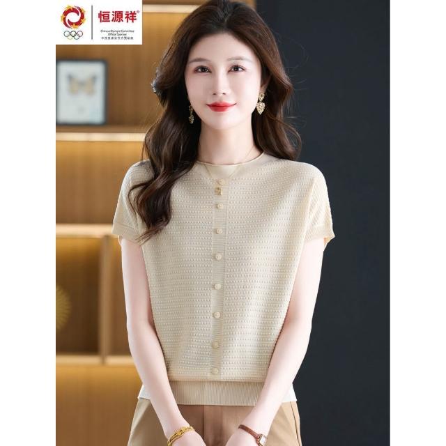 恒源祥媽媽夏裝桑蠶絲短袖t恤女寬松大碼洋氣針織上衣冰絲體恤衫