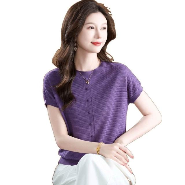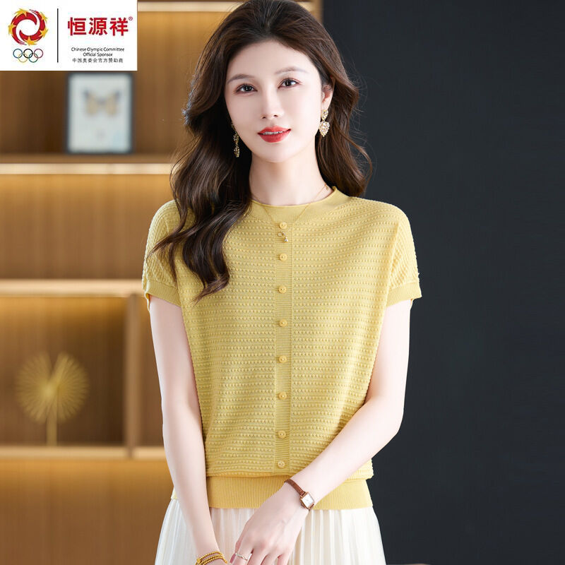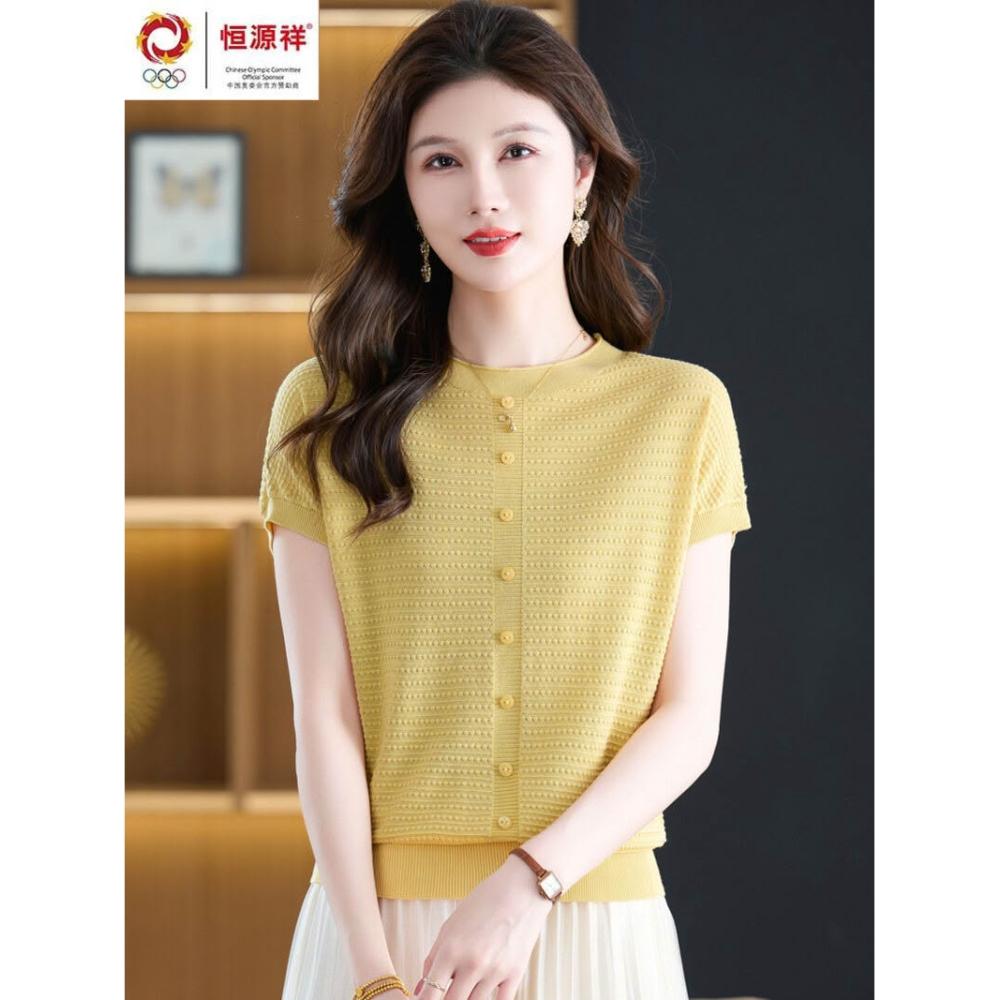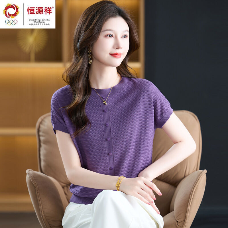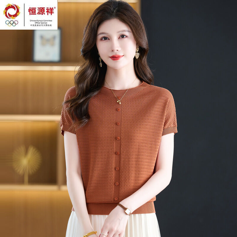 恒源祥媽媽夏裝桑蠶絲短袖t恤女寬松大碼洋氣針織上衣冰絲體恤衫