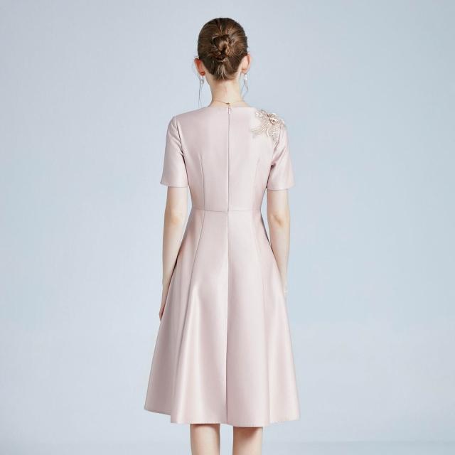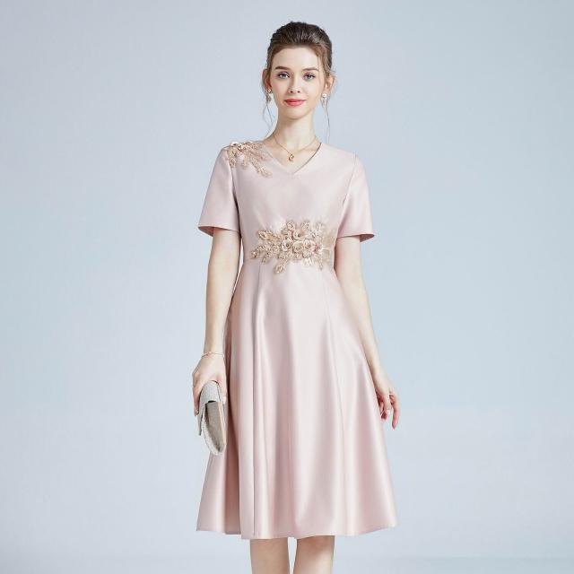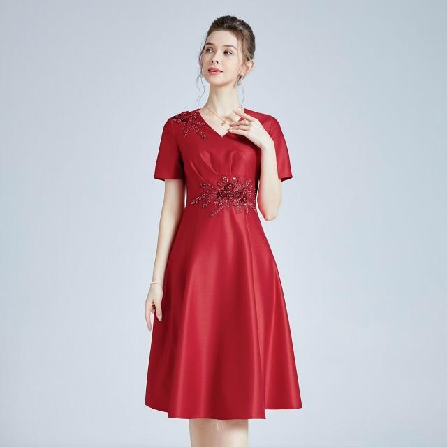 2024夏季中年連衣裙短袖新款婚宴禮服紅色喜婆婆姨媽媽裝