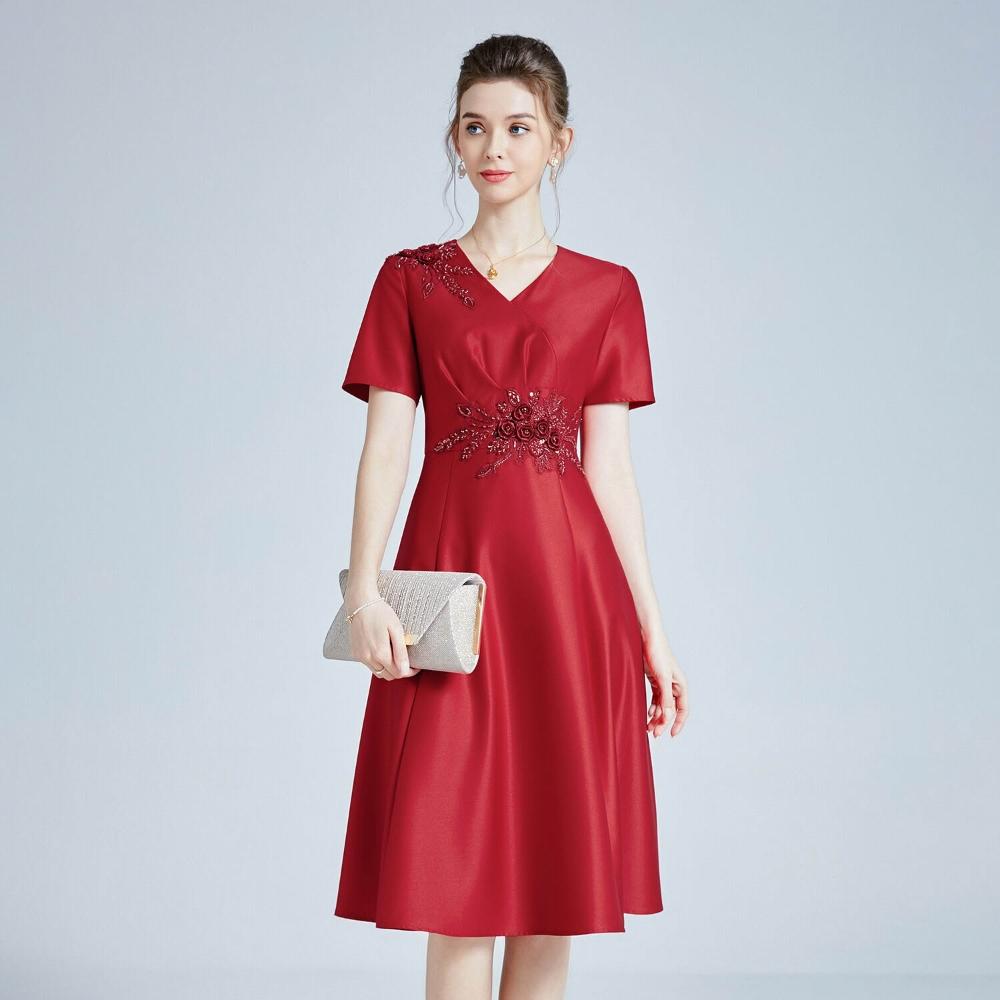 2024夏季中年連衣裙短袖新款婚宴禮服紅色喜婆婆姨媽媽裝