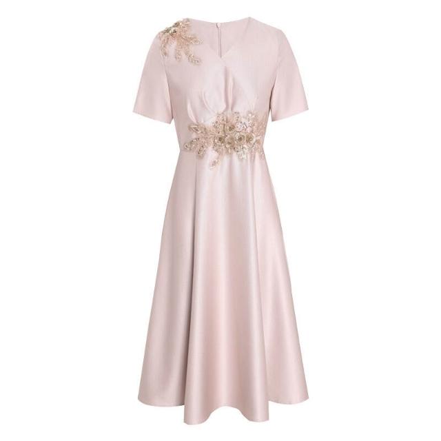 2024夏季中年連衣裙短袖新款婚宴禮服紅色喜婆婆姨媽媽裝