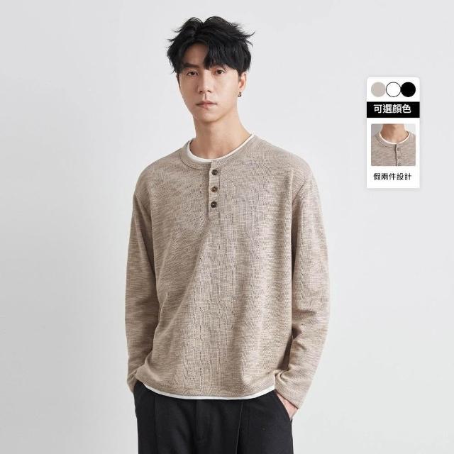 男裝 亨利領假兩件長袖T恤 男春季新款美式寬松內搭 打底衫 長袖T恤