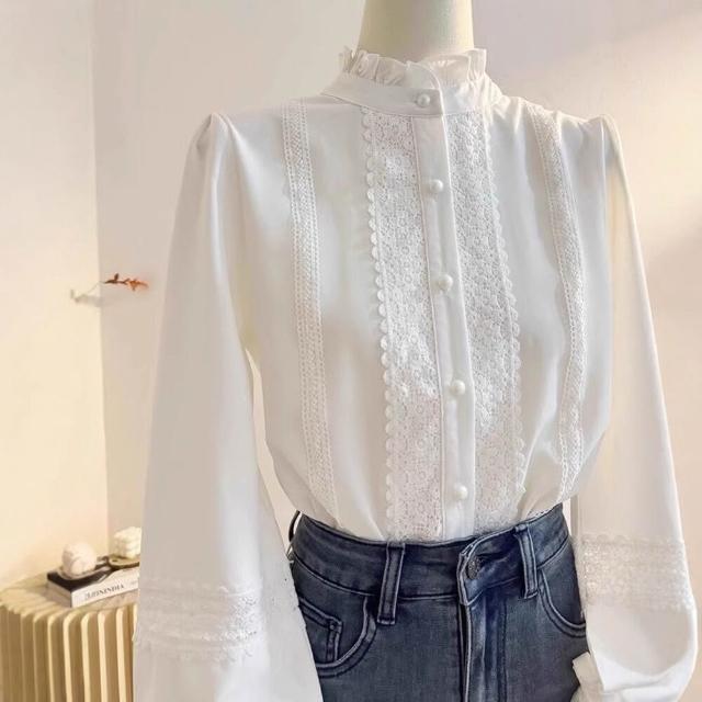 蕾絲花邊拼接白色木耳立領襯衫女2025秋洋氣內搭燈籠長袖小衫上衣
