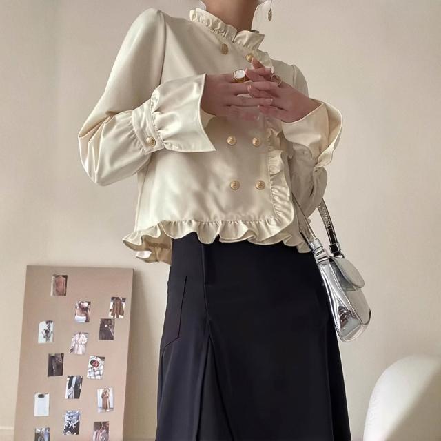法式洋氣立領宮廷風襯衫女春秋新款長袖雙排扣寬松百搭荷葉邊上衣