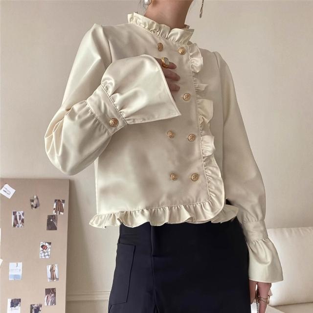 法式洋氣立領宮廷風襯衫女春秋新款長袖雙排扣寬松百搭荷葉邊上衣