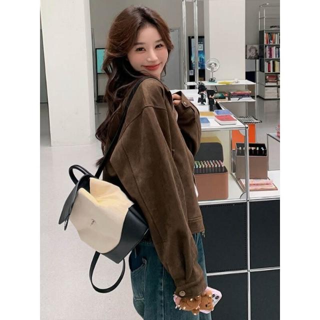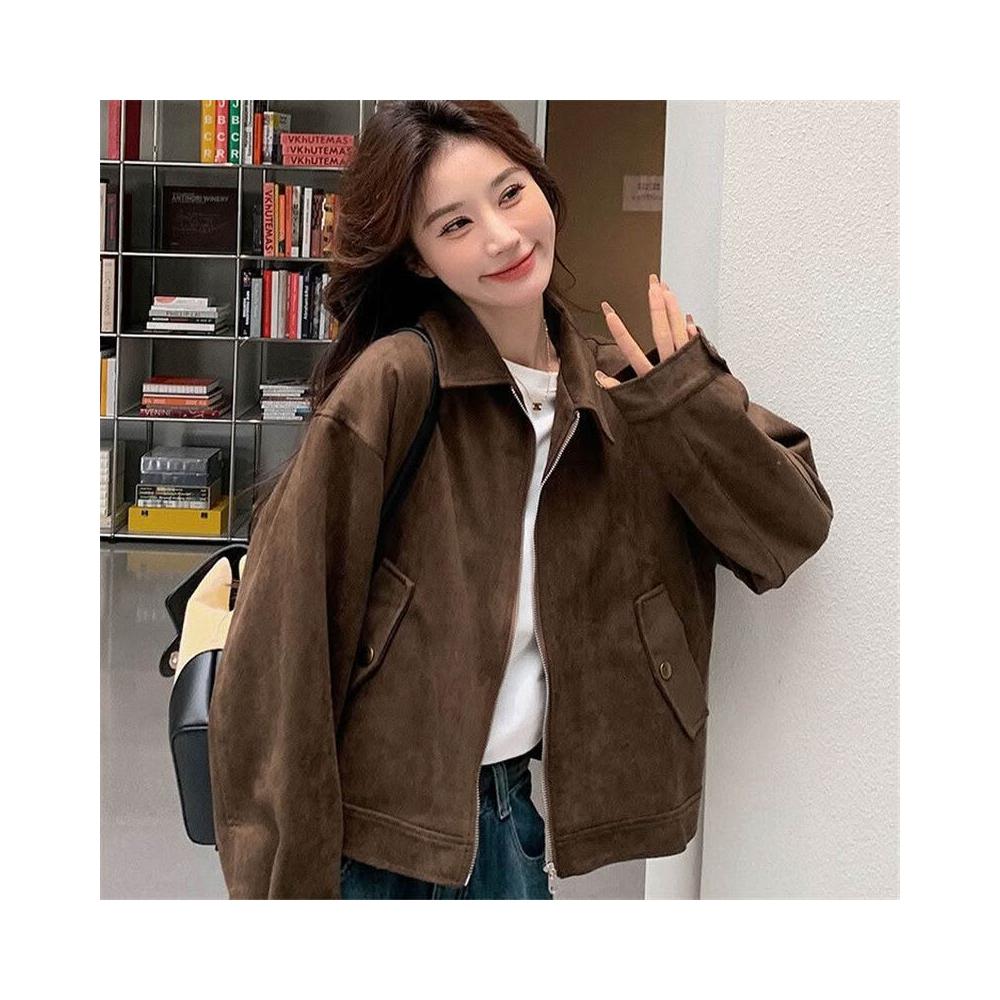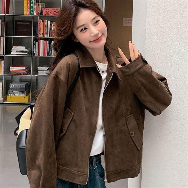咖色美拉德仿麂皮絨外套女2025秋新款美式小個子短款夾克上衣